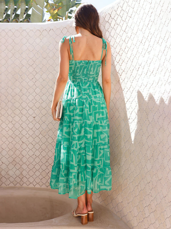 Green graphic print seaside vacation sexy hot girl suspender dress