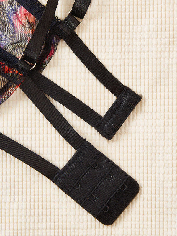 Halloween Erotic Lingerie 4 Piece Skull Printed Bat Neck Sleeve Garter Socks Set