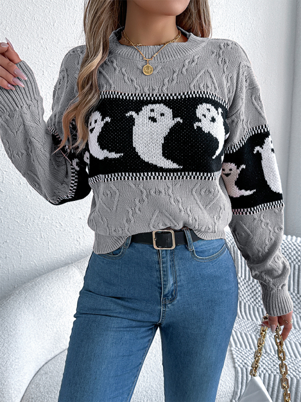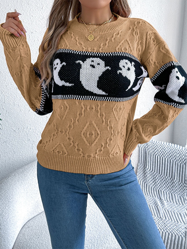 Halloween Themed Spooky Clashing Color Knit Long Sleeve Pullover Sweater